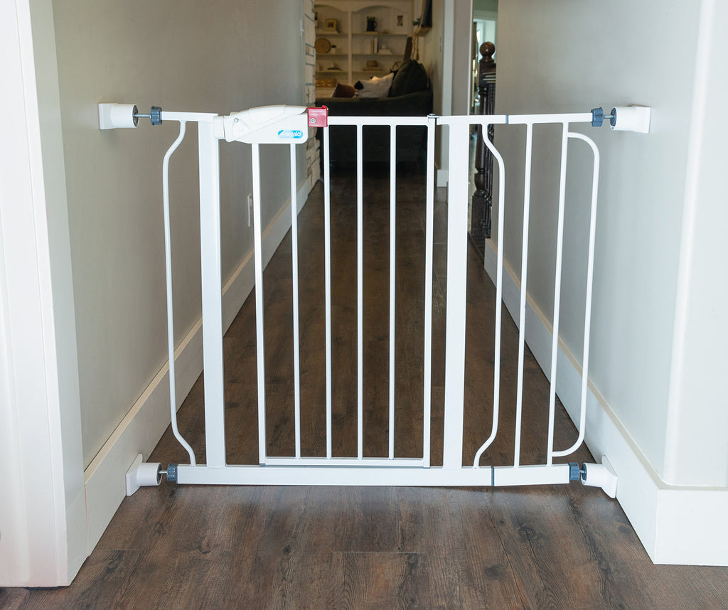 The Wall Nanny Extender adds 6 inches in length to both baby gates and pet or dog gates.  Simply apply each 3 inch extender to each side of the gate spindles and you will have 6 more inches in length to reach your doorway or walls.